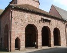 _ Was die Klosteranlage anbetrifft, so folgte einem kleinen Klösterchen als Gründungsanlage mit hölzernem Oratorium (1095) bald eine kleine Steinkirche (1099), schließlich die Fertigstellung des heute noch bestehenden Münsterbaus in Form einer flachgedeckten dreischiffigen Basilika mit Querhaus, Chor und Nebenchören (ca.1130). Südlich davon schloss und schließt sich die Klosteranlage an mit Kapitelsaal (12. Jahrhundert), Kreuzgang und Klausur (1480-1495). Erwähnenswert sind weiter: das Tympanon über dem Westportal (12. Jahrhundert), alte Skulpturen an einigen Säulenkapitellen und -basen, ein Hochaltarschrein (ca.1520) und Epitaphien u.a. Alpirsbacher Äbte.