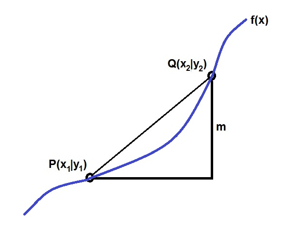 Abbildung: Funktion f(x), Funktionspunkte P(x1|f(x1)), Q(x2|f(x2)); mittlere Änderungsrate m = (f(x2)-f(x1))/(x2-x1).