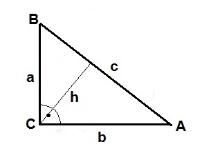 Abbildung: A, B, C = Ecken, a, b = Katheten, c = Hypotenuse, Winkel γ = 90°; a2+b2 = c2 (Satz des Pythagoras); 1/h2 = 1/a2 + 1/b2 ([reziproker] Höhensatz von Hirschbach) bzw. h = ab/c;