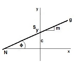 Abbildung:Gerade g: y = mx + c, Steigung m, y-Achsenabschnitt c, Nullstelle N(xN|0), Schnittpunkt mit y-Achse Sy(0|c), Steigungswinkel φ = tan-1(m) (tan(φ)=m).