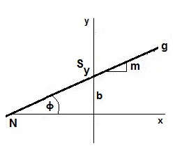 Abbildung:Gerade g: y = mx + b, Steigung m, y-Achsenabschnitt b, Nullstelle N(xN|0), Schnittpunkt mit y-Achse Sy=Q(0|b), Steigungswinkel φ = tan-1(m) (tan(φ)=m).