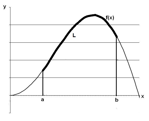 Bogenlängenintegral einer integrierbaren Funktion f(x) auf einem Intervall [a; b] als Summe der Hypotenusen von rechtwinkligen Dreiecken Funktionseingabe (gemäß JavaScript): Variable x, Klammern (), Addition +, Subtraktion -, Multiplikation *, Division /,