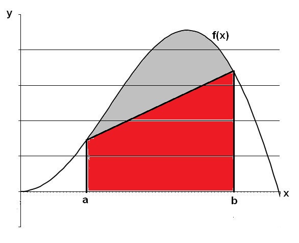 Bestimmtes Integral einer integrierbaren Funktion f(x) auf einem Intervall [a; b] in Näherung als Trapezfläche Funktionseingabe (gemäß JavaScript): Variable x, Klammern (), Addition +, Subtraktion -, Multiplikation *, Division /,