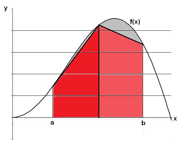 Bestimmtes Integral einer integrierbaren Funktion f(x) auf einem Intervall [a; b] als Näherung von Trapezflächen über Teilintervallen Funktionseingabe (gemäß JavaScript): Variable x, Klammern (), Addition +, Subtraktion -, Multiplikation *, Division /,