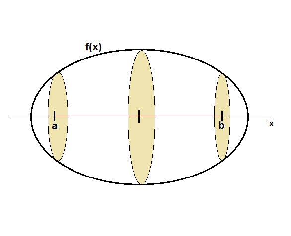 Bestimmtes Volumenintegral einer integrierbaren Funktion f(x) auf einem Intervall [a; b] als gewichtete Summe von Querschnitts-/Kreisflächen Funktionseingabe (gemäß JavaScript): Variable x, Klammern (), Addition +, Subtraktion -, Multiplikation *, Division /,