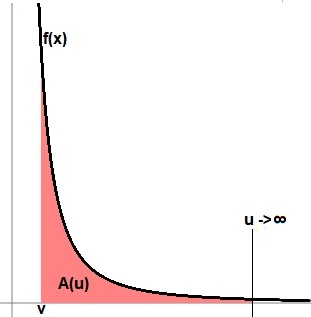 Uneigentliches Integral einer integrierbaren Funktion f(x) = aebx+c > 0, a>0, b<0, auf einem Intervall [v; ∞) -> A = v∫∞ f(x) dx als unendlich lange Fläche mit endlichem Flächeninhalt.