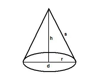 Abbildung:r = Radius, h = Höhe,s = Mantellinie, d = Grundflächendurchmesser