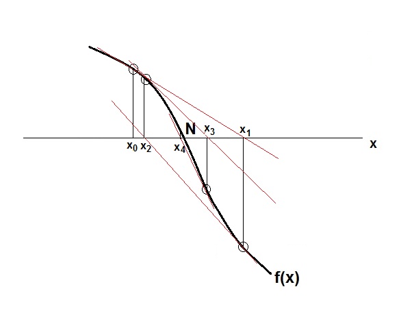 Abbildung: Funktion f(x), Ableitungsfunktion f'(x), Anfangswert x0 -> Newtonverfahren als rekursive Folge mit Iteration xn+1 = xn - f(xn)/f'(xn).