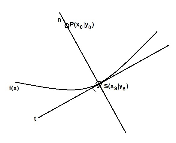 Abbildung: Funktion f(x), Punkt P(x0|y0), Normalengleichung: y0 = -(x0-u)/f'(u) + f(u) -> Lösungen als Schnittpunkte S(xS|f(xS)) mit rechtem Winkel zwischen Normale und Funktion, mit kleinstem Abstand zwischen Funktion und Punkt P. Funktionseingabe (gemäß JavaScript): Variable x, Klammern (), Addition +, Subtraktion -, Multiplikation *, Division /,