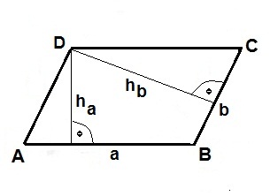 Abbildung: A, B, C, D = Ecken, a, b = Seitenlängen, ha, hb = Höhen; A = aha = bhb; U = 2a+2b.