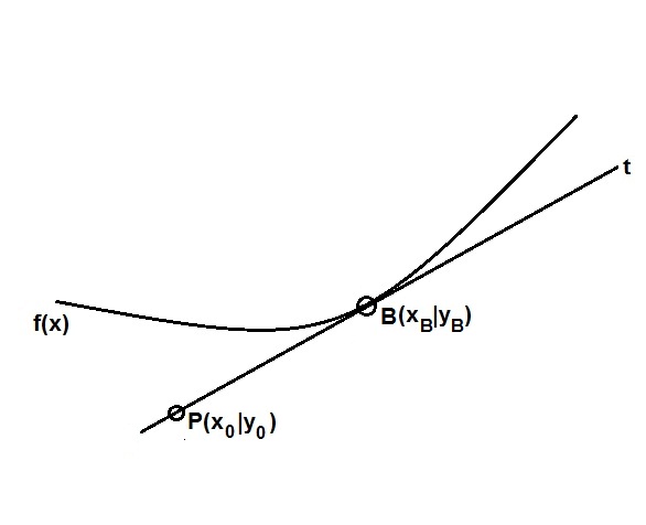 Abbildung: Funktion f(x), Punkt P(x0|y0), Tangentengleichung: y0 = f'(u)(x0-u) + f(u) -> Lösungen als Berührpunkte B(xB|f(xB)).