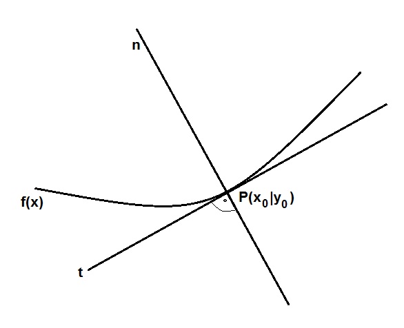 Funktion f(x), Stelle x0 -> Punkt P(x0|f(x0)) = P(x0|y0) -> Tangente an Funktion im Punkt: t: y = f'(x0)(x-x0) + f(x0), Normale senkrecht zur Tangente im Punkt: n: y = -(x-x0)/f'(x0) + f(x0).