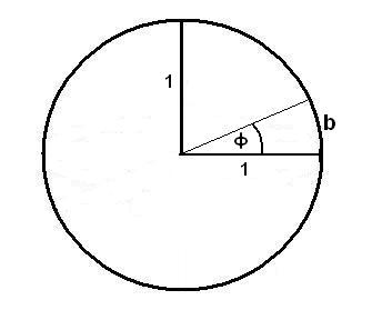 Abbildung:Einheitskreis, φ = Winkel, b = Bogenmaß; φ = 180°*b/π, b = π*φ/180°.