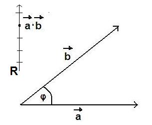 Abbildung:Eingeschlossener Winkel φ ergibt sich aus: cosφ = a->*b->/|a->|/|b->| bzw. φ = cos-1(a->*b->/|a->|/|b->|).