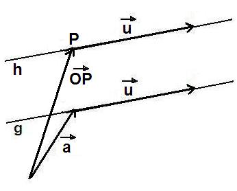 Abbildung:Punkt P, Gerade g: x-> = a-> + t*u-> mit Stützvektor a-> und Richtungsvektor u->, parallele Gerade h: x-> = OP-> + t*u-> mit Stützvektor OP-> und Richtungsvektor u->.