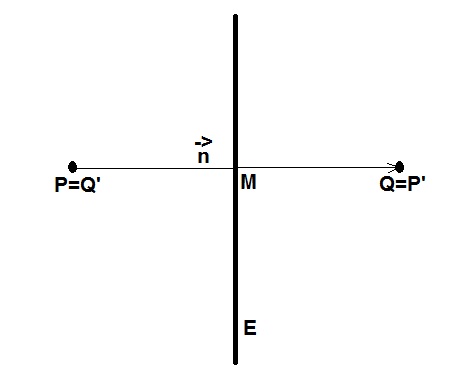 Mittelpunkt M der Punkte mit OM-> = (OP-> + OQ->)/2, Spiegelebene E: (x-> - OM->)*PQ-> = 0