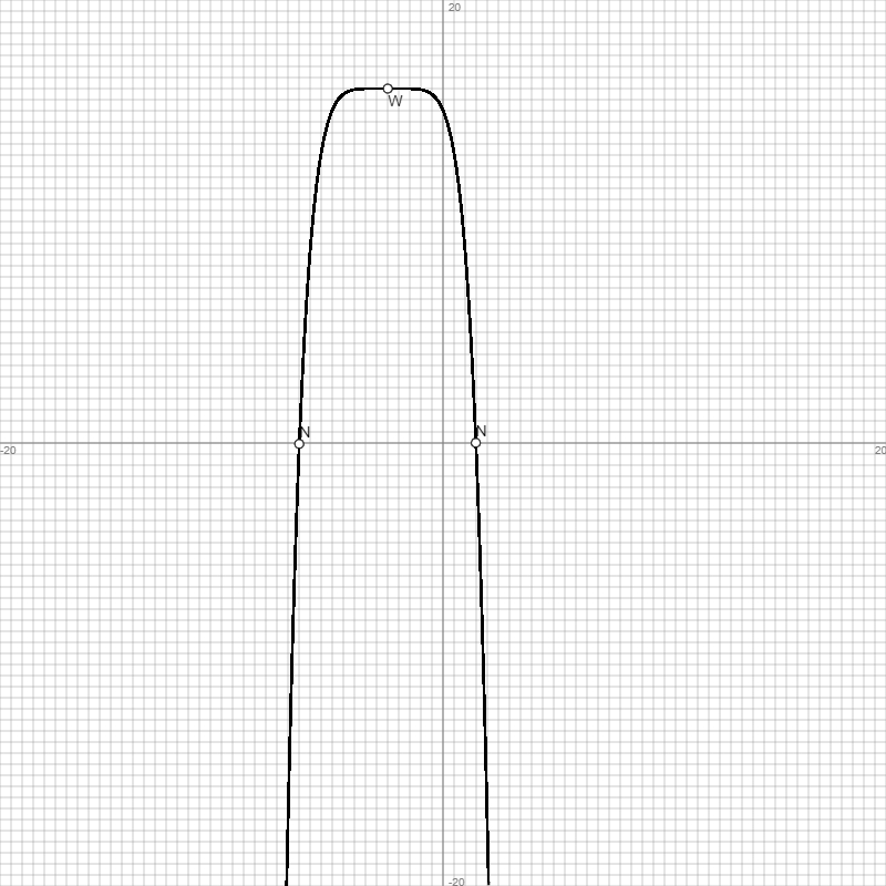 Funktion: f(x) = -0.004·(x+2.5)6 + 16, Df = R, Wf = (-∞; 16], Potenzfunktion 6. Grades, nach unten geöffnet, entlang der x-Achse und der y-Achse verschoben, Funktion achsensymmetrisch zur Senkrechten x = -2.5, x -> -∞: f(x) -> -∞, x -> +∞: f(x) -> -∞ ->