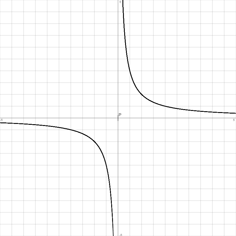 Funktion: f(x) = 1/x, Df = R\{0}, Wf = R\{0}, Standardhyperbel, Funktion punktsymmetrisch zu O(0|0), x -> -∞: f(x) -> 0 = y als Grenzkurve, x -> +∞: f(x) -> 0 = y als Grenzkurve ->