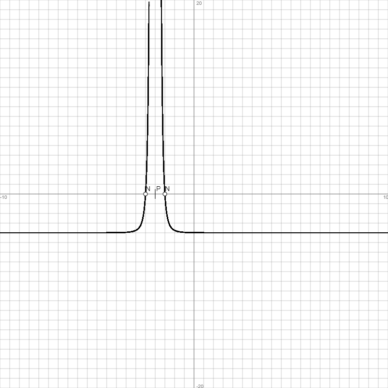 Funktion: f(x) = 0.25/(x+2)4 - 4, Df = R\{-2}, Wf = (-4; +∞), Hyperbel, gestaucht, entlang x-Achse und y-Achse verschoben, Funktion achsensymmetrisch zur Senkrechten x = -2, x -> -∞: f(x) -> -4 = y als Grenzkurve, x -> +∞: f(x) -> -4 = y als Grenzkurve ->