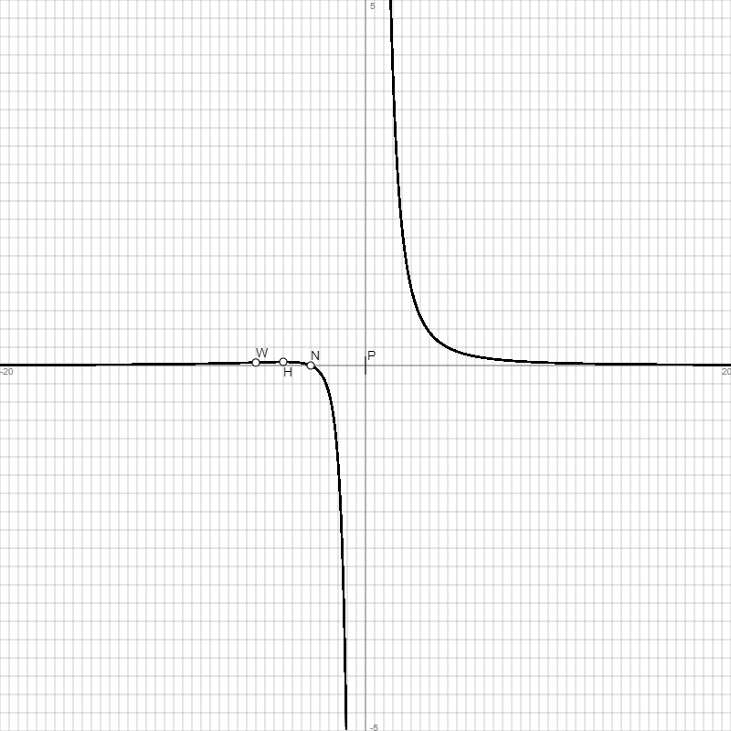 Funktion: f(x) = , Df = R\{0}, Wf = R, gebrochen rationale Funktion, x -> -∞: f(x) -> 0 = y als Grenzkurve, x -> +∞: f(x) -> 0 = y als Grenzkurve ->