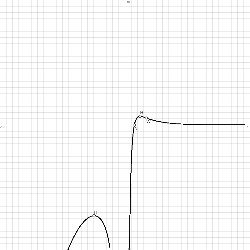 Funktion: f(x) = , Df = R\{0}, Wf = (-∞; 0.6863], reelle Funktion, x -> -∞: f(x) -> -∞, x -> +∞: f(x) -> 0 = y als Grenzkurve ->
