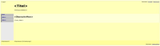 Die nachstehende Beispielwebsite soll aus Seiten mit immer demselben Layout bestehen. Die Seiten sind über Links in einer Menüleiste verbunden. Jede Seite besteht aus sechs Feldern in zwei Spalten mit je drei Zellen (Kopf, Hauptteil, Fuß):